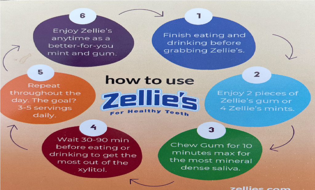 In other words, when you chew gum, swoosh a mint with xylitol, or use crystals as a sweetener, the harmful bacteria in your mouth die. View www.healthline.com for more information. Dr. Phillips recommends her brand – Zellie’s Xylitol gum or mints after every meal. Use recommendations are as follows: